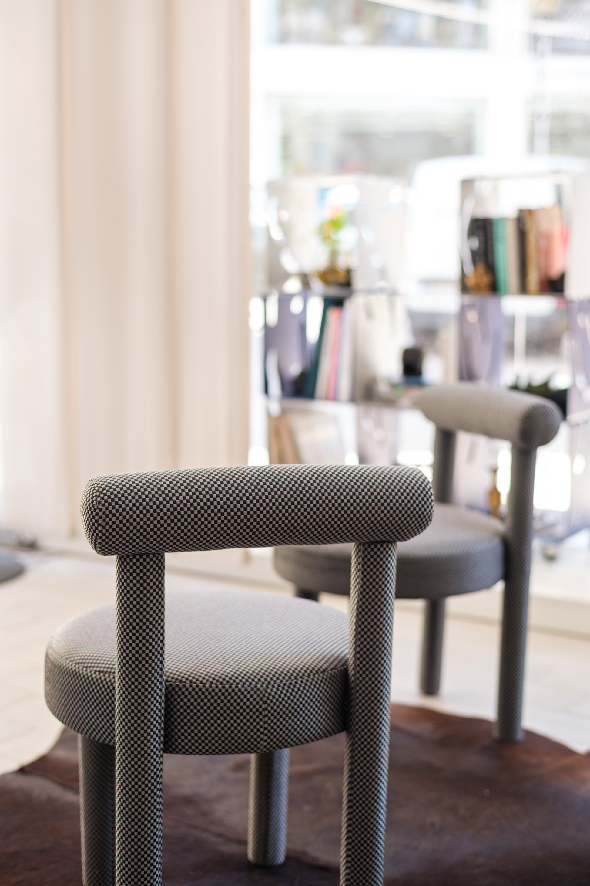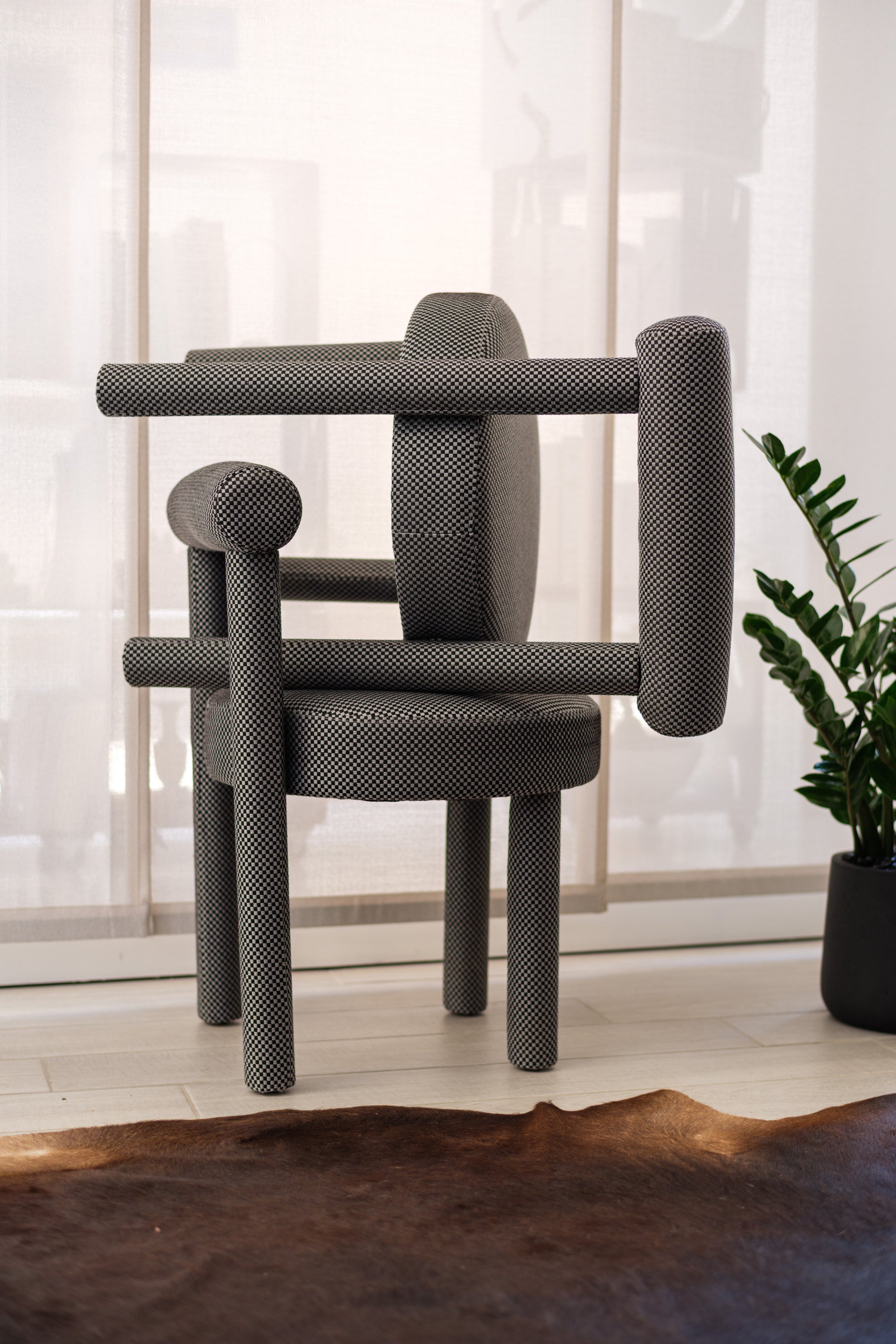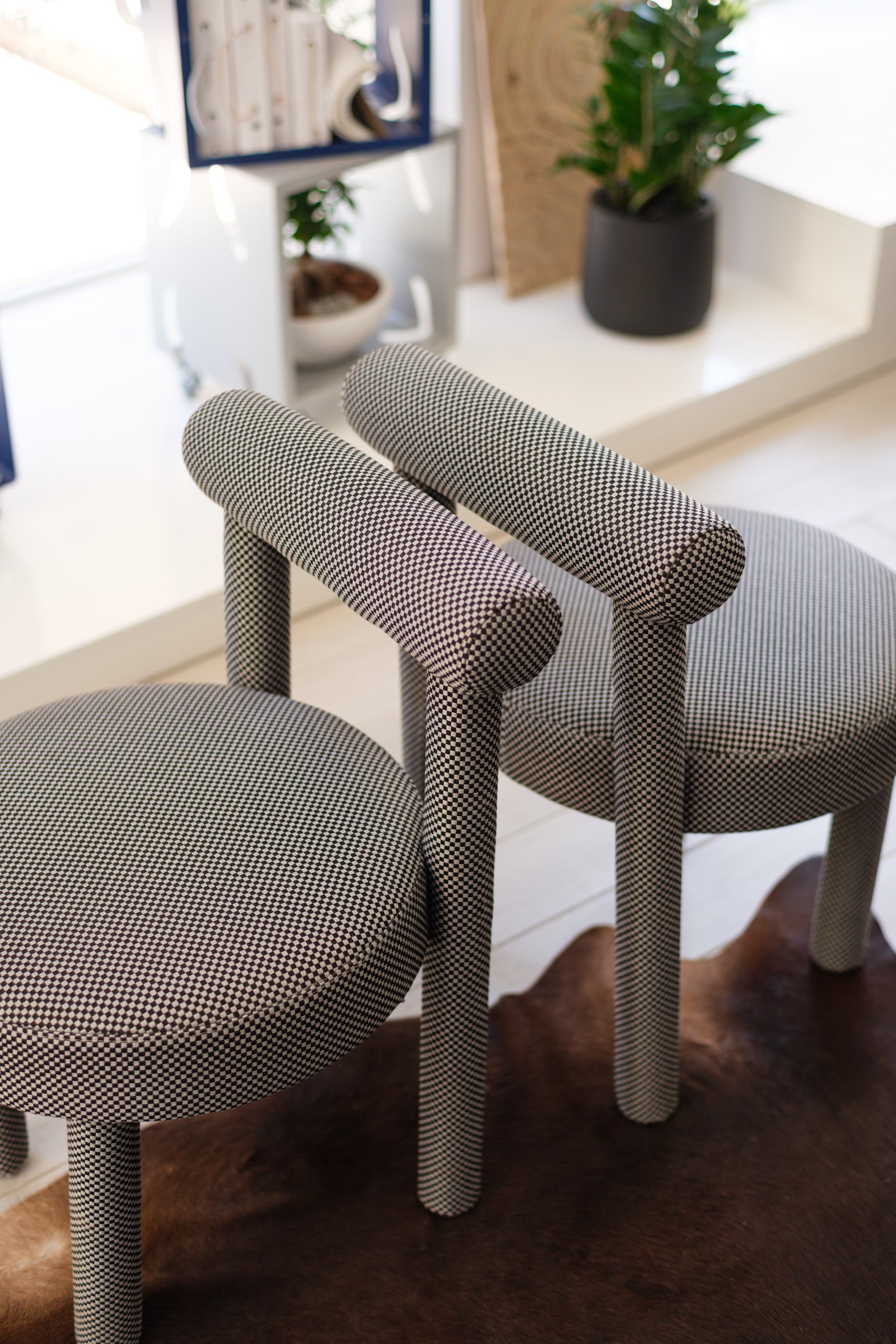 Sculptural and minimalist, the Tondo chair features a striking black-and-white houndstooth fabric upholstery. Its rounded seat and padded cylindrical backrest combine comfort with architectural elegance.